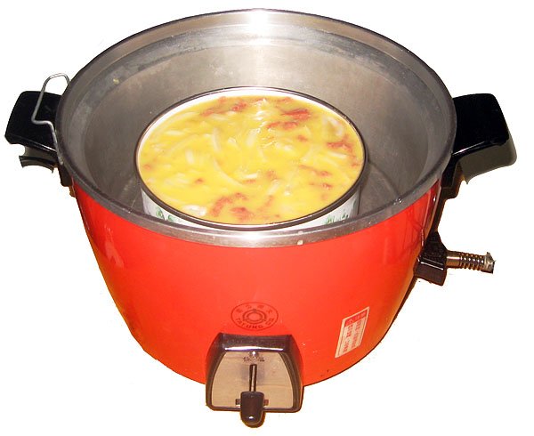 從小家長常常煮蒸蛋給我當一餐, 我家都叫這道菜做蛋布丁, 單吃或拌飯都很讚, 用電鍋即可完成! 不過我家原始煮法是只有蛋跟水, 不加其他料, 調味則是鹽跟糖等量. 我家啥菜都喜歡加糖, 番茄蛋, 蛋捲都會加糖, 不知道別人家是否也一樣. 前幾天即將搬到日本的好友Monica把她的大同電鍋轉送我, 自從6年前離家我就沒摸過電鍋了呢! 也因為沒有電鍋就幾乎沒再做過蛋布丁. 這次跟大同電鍋重逢有點小感動, 不過小時候家裡的電鍋很破舊, Monica的電鍋當然體面多了, 所以親切感沒那麼強烈>.< 今天的晚餐就煮加料的蛋布丁!