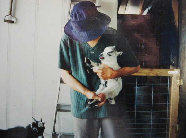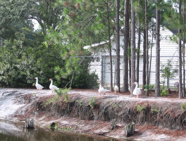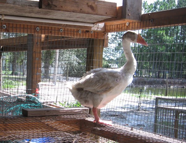 我拜訪的期間, 發現池塘那邊有隻孵蛋的鵝被其他兩隻鵝不斷修理, 毛都被咬光了, 趕快叫媽媽把牠救出來. 這隻母鵝被欺負得厭厭一息, 但當媽媽要抓牠出來時還企圖咬她, 媽媽一時不敢碰牠, 只好換我出手抓住母鵝的脖子讓牠無法咬人, 關到雞舍裡去. 這下子同一格裡就有一雞一鴨一鵝, 都是沒鳥緣的, 天啊!