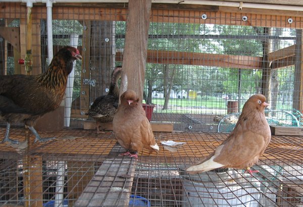 媽媽也不知道這些鴿子從那冒出來的, 在那裡猜測會不會自己飛來縮小穿過網子擠進雞舍再恢復原狀?(真是異想天開), 或是隔壁工人抓來的(比較合理). 她先生回家後說不知道鴿子的事, 媽媽就更在這兩個推測間打轉了, 碎碎唸了一會兒, 正說到"這5隻鴿子....", 她先生沉不住氣地說那有5隻, 是6隻3對啦! 媽媽馬上餓狼眼發光說吼! 原來你知道鴿子的事! 她先生只好承認是稍早路過寵物店看到鴿子很可愛, 買回來靜悄悄放進雞舍的 XD