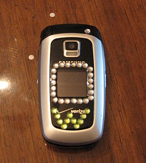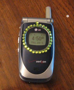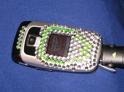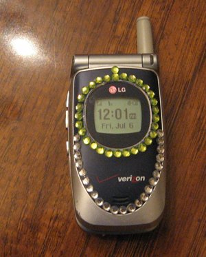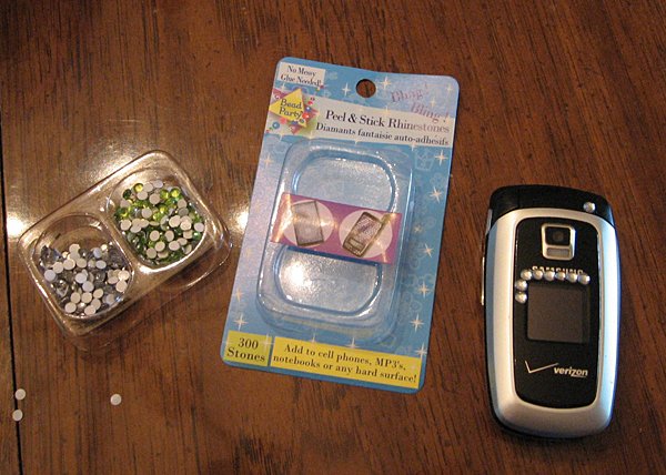 我媽媽50多歲了, 個性還是很率真也不世故, 可以說保留了一份童心吧! 這次我去找她玩, 她看到我貼滿水鑽的手機, 相當著迷呢! 要求我也幫她的手機貼貼, 可是事先不知道她會有這樣的請求, 我根本沒帶水鑽來, 還好到Walmart逛時, 看到手工藝區有賣多種水鑽耶! 美中不足的是都算大顆, 不過最小的那種貼手機是沒問題. 於是就買了一包綠色跟透明水鑽的組合回家, 這種水鑽背後貼紙撕掉有黏性, 不需要再另外上膠水很方便! 但為了牢固起見, 我貼好後又塗了一層透明指甲油.