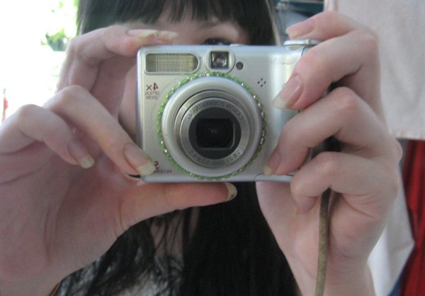還剩下很多水鑽, 我乾脆把自己的數位相機也沿著鏡頭貼了一圈綠水鑽!