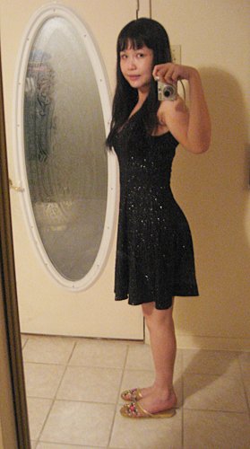鞋子也是一定要穿的! 這趟到佛州, 因為媽媽說她那邊準備了不少衣服給我, 叫我不用帶衣服了. 我當然沒那麼笨, 出遠門不帶衣服等於不帶錢包啊! 何況我還有招牌辣妹風要顧及XD 所以還是塞了3套衣服, 行李算不重. 我穿了一件綴滿點點金色亮粉的小禮服出發, 可惜皮膚狀況不好時穿一整天會刺痛: