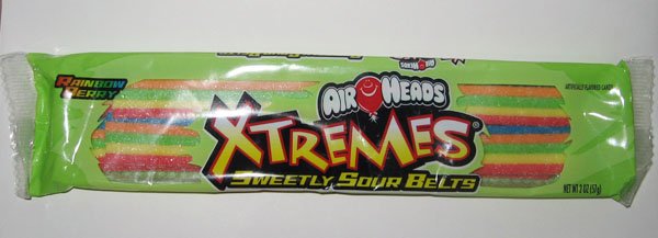 首先是一切的罪虧禍首Airheads Xtremes Sweetly Sour Belts(Rainbow Berry), 我是在FashionGuide討論區看到有人問那裡有賣這種糖果, 並宣稱是她吃過最好吃的酸痠軟糖! 結果我就上Google搜尋, 才因此闖進Candy Blog的. 這種糖果特色就是相當酸, 長條狀軟軟QQ的, 外裹一層砂糖. 我發現把那層砂糖舔掉後, 軟糖本身就有點酸過頭了, 不太能體會"最好吃"這個形容詞 囧rz