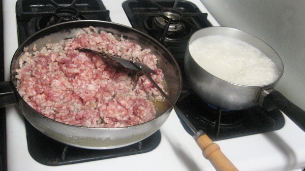 我家沒有電鍋, 所以飯是用瓦斯爐煮的, 我沒有量米跟量水的習慣, 都是用目測, 總之在湯鍋裡放置適量的米跟水, 放到瓦斯爐上開小火煮. 然後把煎鍋沖個水準備對付豬肉, 我是買一英鎊瘦豬絞肉跟一英鎊肥豬絞肉混合, 鋪到倒了2湯匙蔬菜油的煎鍋上開最大火開始加熱時, 旁邊的米也開始滾了.