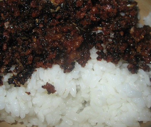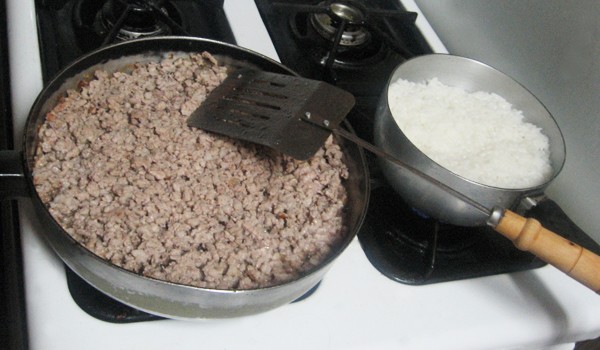 5分鐘後絞肉全部熟了, 但是不要去動, 照片中可看到飯也快熟了, 用瓦斯爐煮很有效率吧!