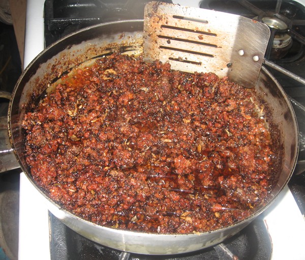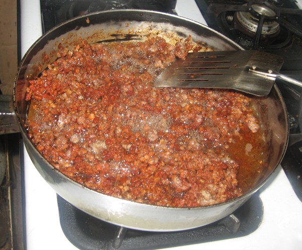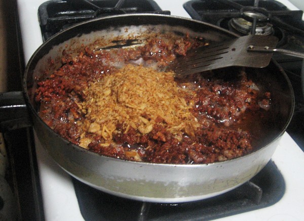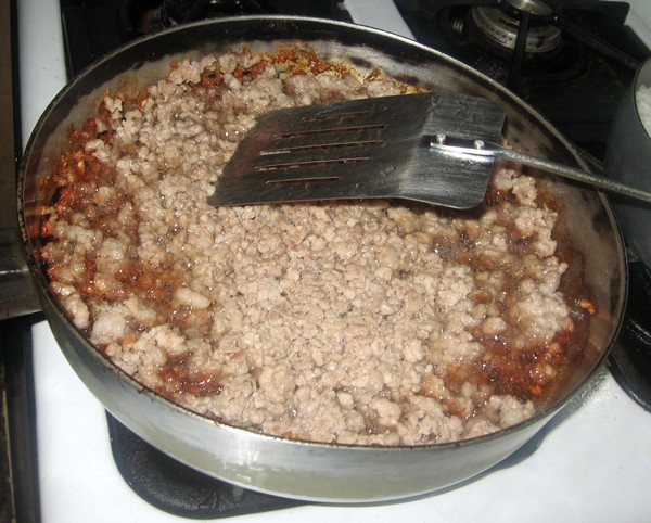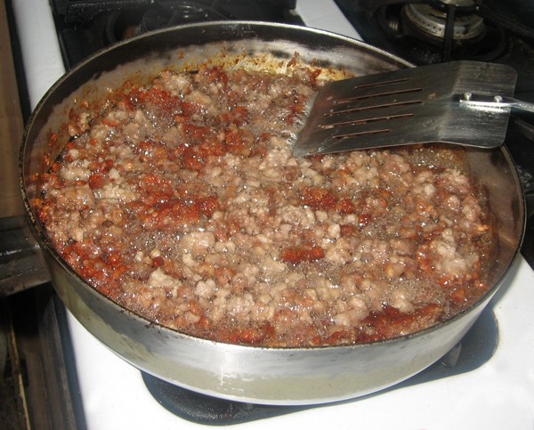 把開始變褐的絞肉徹底翻過, 已經出很多油了, 最大火力下的超燙油會把全部豬肉很快炸酥, 人可以走開不需要去攪動.