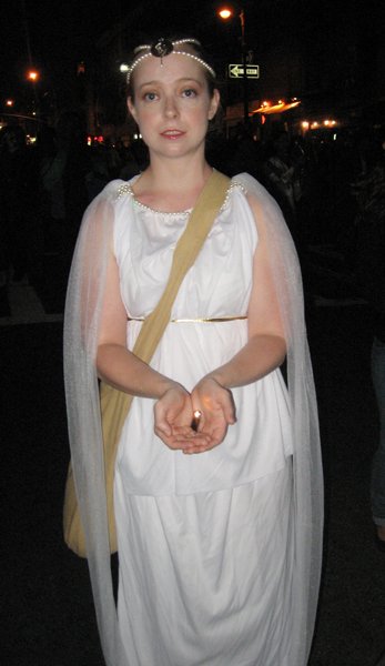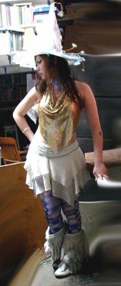 服裝則是決定穿以前在五分埔買的金屬片上衣跟紐約買的白短裙, 加上最近買到的普普風藍褲襪, 所以這次行頭的成本只有花了做帽子的材料費, 多發揮創意可以省下好多$$啊!