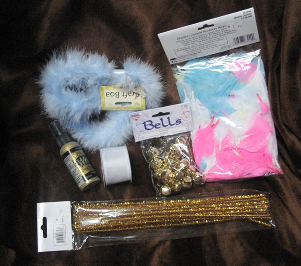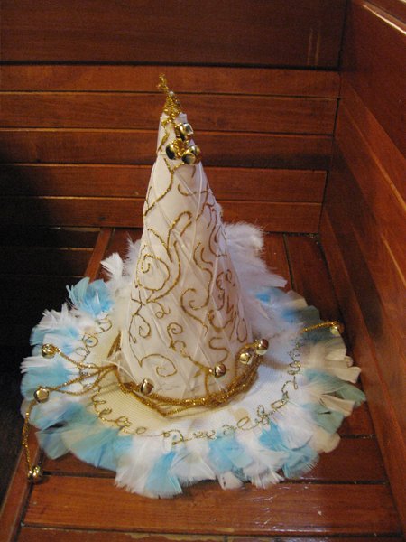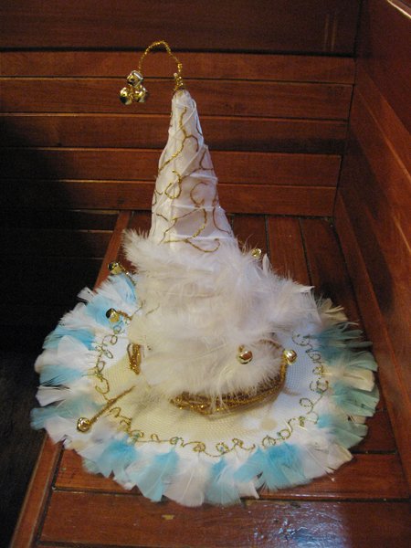 用白紙捲成尖筒黏在帽子上, 以白紗緞帶纏繞, 用釘書針固定, 結果緞帶不夠用有留白, 就黏白羽毛遮掩. 帽緣黏白色跟藍色羽毛, 根部用金蔥膠畫上線條, 尖筒沒有羽毛的部位也畫金蔥線裝飾, 尤其遮掩釘書針. 最後用金蔥鐵絲纏繞尖筒根部, 每根鐵絲尾端掛鈴鐺. 結果滿成功的, 遊行中要求給我拍照的人比去年多很多! 帽子正面的樣子: