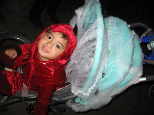 小弟弟連嬰兒車都裝飾了蛛絲跟玩具蜘蛛, Monica手太巧了!