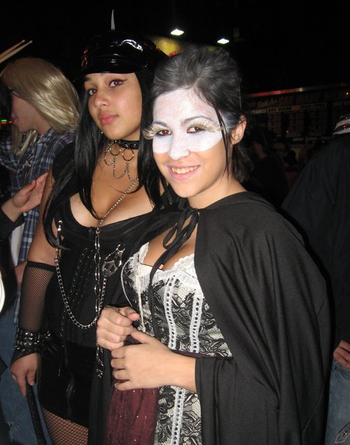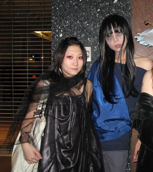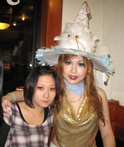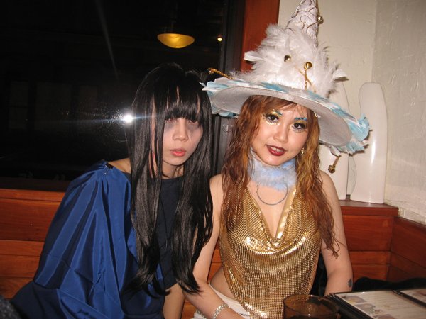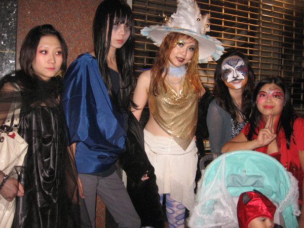 下面是大家合照, 由左至右: 小正妹皮皮, 扮成女鬼的小帥哥莊軒(他念服裝設計, 皮皮跟他自己的服裝都是他親手做的喔!) 我, 金滿, Monica: