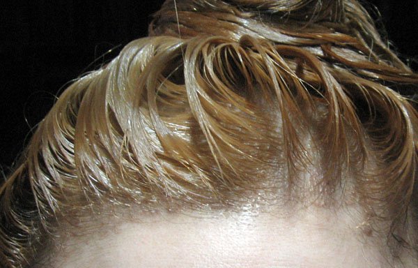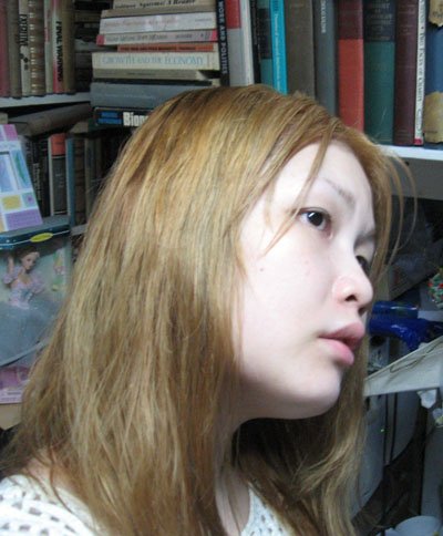我把染色膏擠進作用劑瓶子裡搖勻, 戴上手套開始塗到頭髮上了, 剛開始還擔心藥劑不夠全頭用, 結果全部頭髮都順利吸飽了藥劑. Clairol這個染髮劑很燻眼燻鼻, 比L'Oreal的漂白劑刺激多了, 不過沖洗掉又潤絲過後倒沒留下藥劑味. 剛塗上去時顏色比我想像的深, 不太像亞麻色: