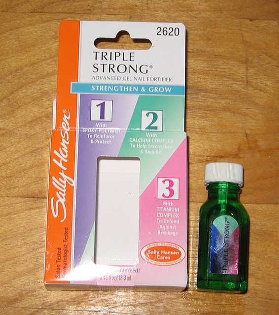 上個學期我為了通過鋼琴考試, 指甲完全剪短, 後來整個寒假到現在一直努力重新把指甲留長. 長長的指甲卻很容易意外斷掉又得重來一次, 不堪其擾之下, 我到藥妝店物色指甲強化劑或修補裂痕的產品, 結果看到一大堆號稱不但可以讓指甲超級堅硬, 還可在一星期內變長50%以上的指甲保養品! 指甲正常成長速度是一個月一公分, 所以那些產品包裝上宣稱的加速成長功效我是不太相信啦, 最後挑了Sally Hansen的Triple Strong強化劑, Makeup Alley上評價很好, 它的包裝上也沒有誇大的文字, 只就事論事地寫說可促進成長跟強化指甲.