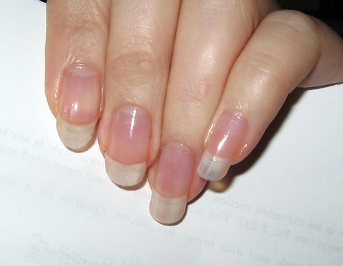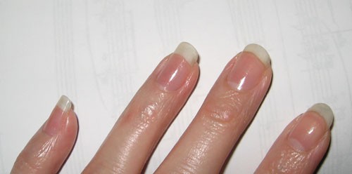 指示寫說每個禮拜擦兩三次, 指甲兩面都要擦, 然後卸掉重擦, 不然一直疊會變很厚. 我發現擦了這個Triple Strong後不能企圖用剝掉的, 指甲本身會跟著剝掉一層, 顯然它有滲透到指甲表層哩! 使用到現在, 雖然兩手大拇指指甲都不約而同齊根斷掉, 但其他的指甲都真的被保護得很好! 兩手的無名指從一開始擦其實邊緣就有裂痕了, 但到現在都沒斷掉! 令我對這強化劑感到滿佩服的! 下圖是幾乎一個月後的長度, 是沒有長出像雜草那樣的長度啦XD 可是就強化跟保護而言, 有達到目標, 而且乾得很快! 所以是值得推薦的產品!