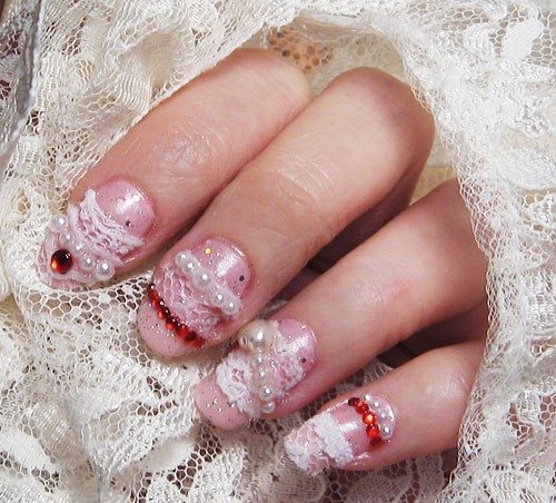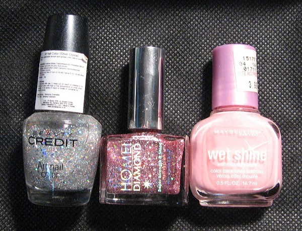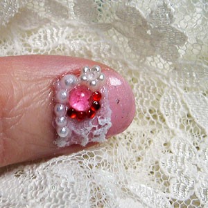 左手是先擦Mayebelline Wet Shine色號80H2O Pink, 再塗一層Beauty Credit銀色亮片, 乾了以後刷一層透明指甲油, 馬上拿適當大小的蕾絲壓住. 在指甲上貼蕾絲很容易, 可是要在蕾絲上貼珠珠卻很難黏著, 我還動用了Carie假睫毛膠才固定住珍珠跟水鑽, 然後用快乾的Triple Strong厚厚塗上去加強固定.