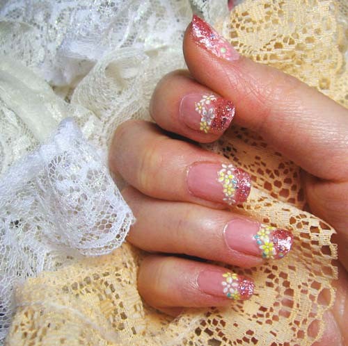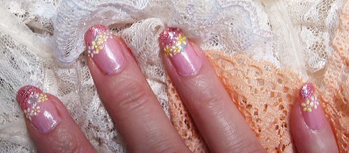 右手就偷懶了, 也是塗成粉紅色, 沿著微笑線斜斜貼了小花貼紙, 再用紫紅色亮片指甲油畫尾端, 這其實很類似去年最後一次PO的指甲彩繪結婚蛋糕.